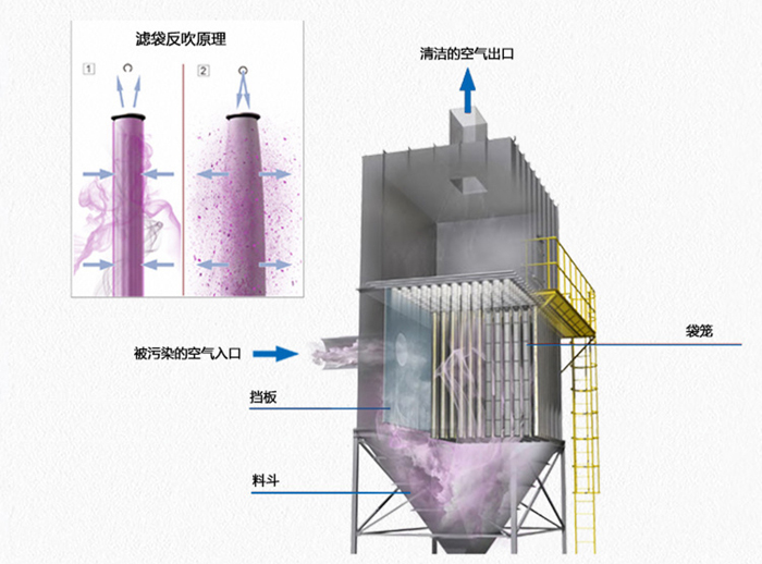 布袋除塵器主要由上部箱體、中部箱體、下部箱體(灰斗)、清灰系統(tǒng)和排灰機(jī)構(gòu)等部分組成。布袋除塵器性能的好壞,除了正確選擇濾袋材料外,清灰系統(tǒng)對布袋除塵器起著決定性的作用。為此,清灰方法是區(qū)分布袋除塵器的特性之一,也是布袋除塵器運(yùn)行中重要的一環(huán)。